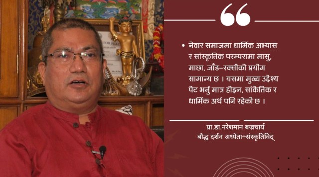 नेवार समाजमा धार्मिक अभ्यास र सांस्कृतिक परम्परामा मासु, माछा, जाँड–रक्सीको प्रयोग सामान्य छ। यसमा मुख्य उद्देश्य पेट भर्नु मात्र होइन, सांकेतिक र धार्मिक अर्थ पनि रहेको प्राडा बज्राचार्यले बताए। तर शिक्षा र जनचेतनाको विकाससँगै यस्ता अभ्यासहरूमा सचेतनता आएको छ र अनावश्यक बलि दिने चलन घट्दै गएको छ।